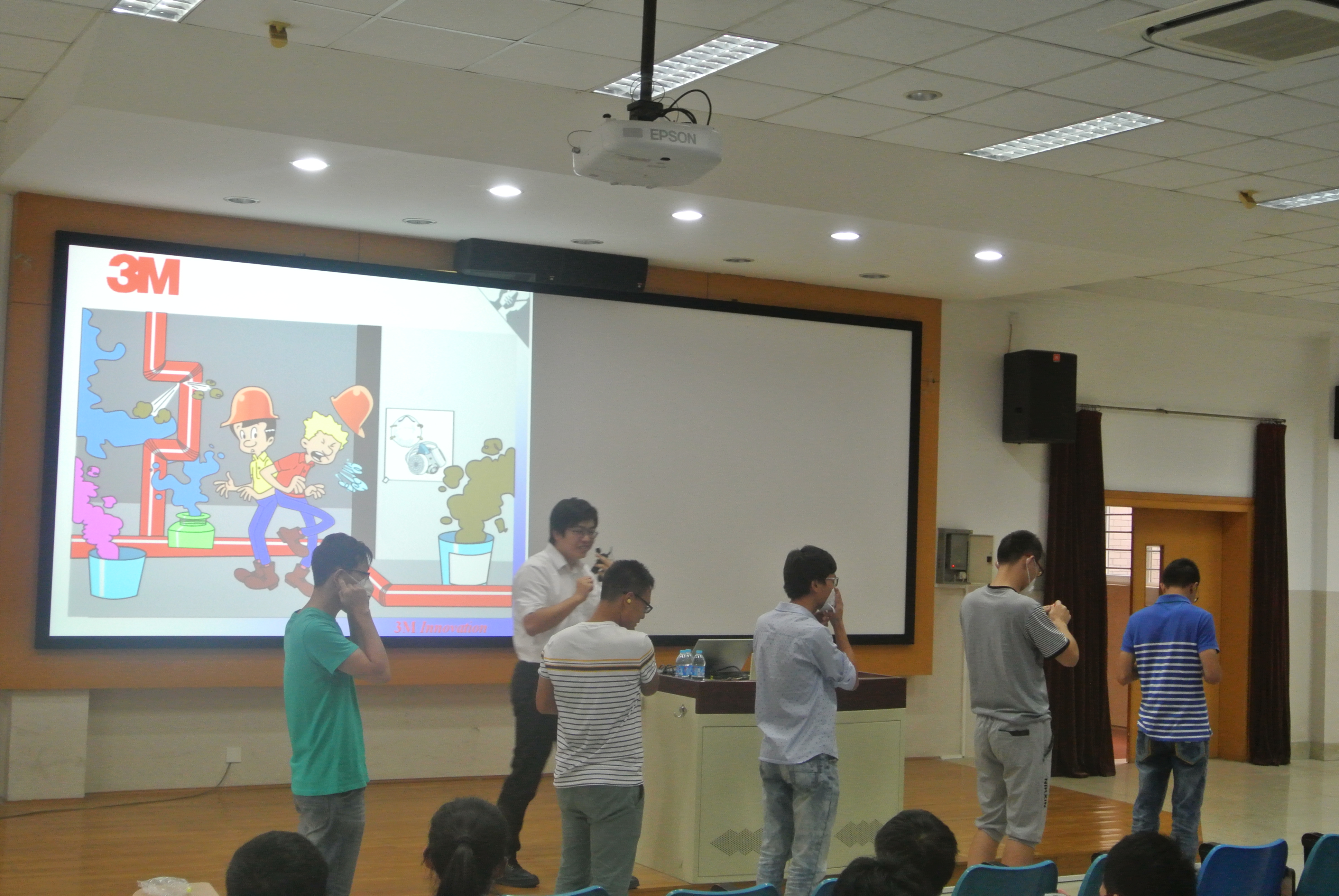 随后陆文校友围绕“识别呼吸危害”,“了解污染物对人体的健康危害”,“选择合适的呼吸器”,“培训正确使用和防护”四个方面向同学们重点讲解了呼吸保护的相关知识。他通过游戏互动环节向同学们强调了正确使用个人防护用品的重要性,并亲自示范了防尘口罩、防毒面具等个人防护用品的正确使用方法,得到同学们的广泛赞同。