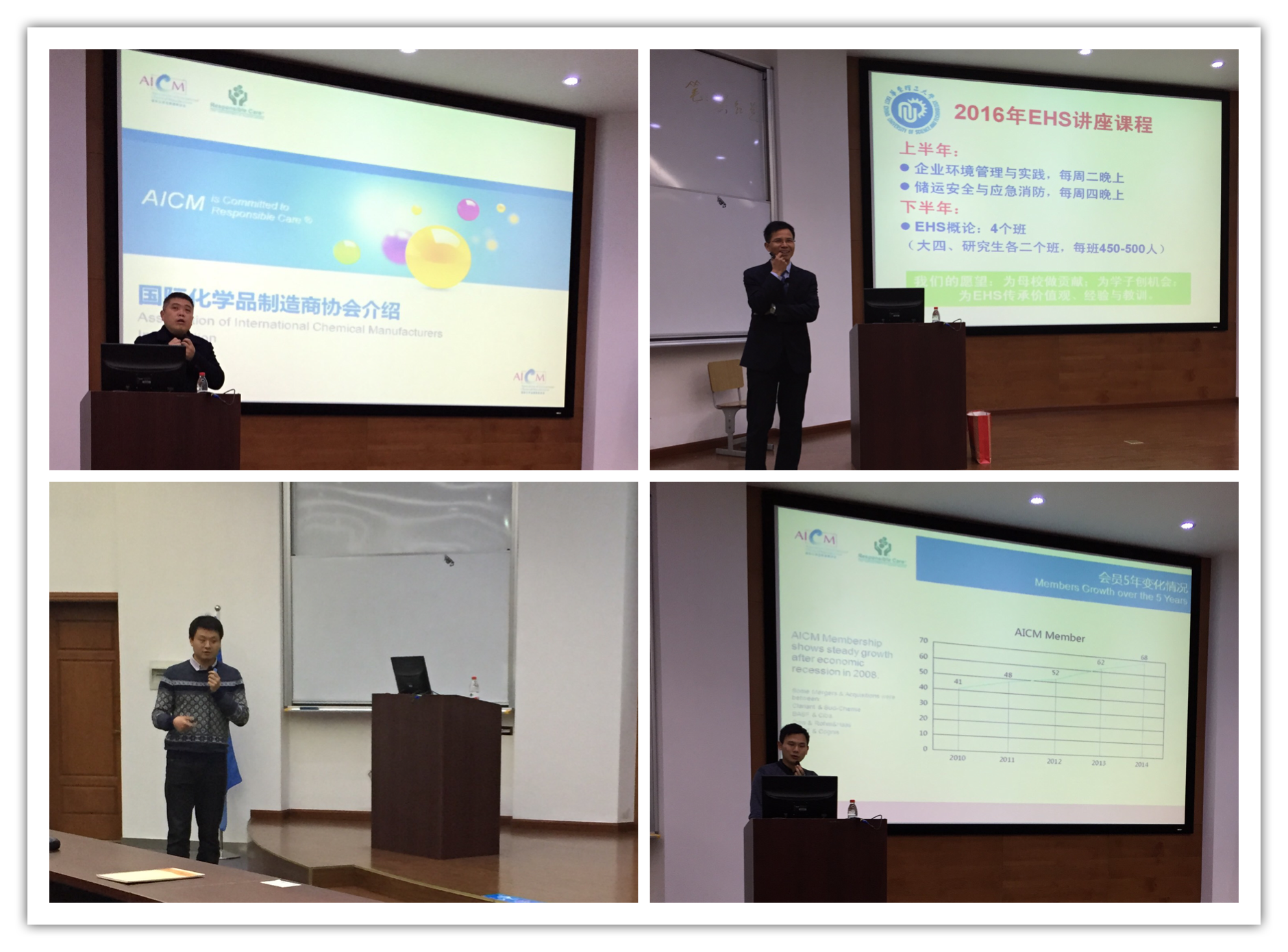 分党委书记李涛教授感谢校友抽出宝贵时间与研究生进行交流,鼓励同学们把环境、健康和安全理念始终贯彻到工作、学习和生活中,并把校友的无私奉献精神传递下去。课程赞助单位AICM负责人也对AICM做了相关介绍。