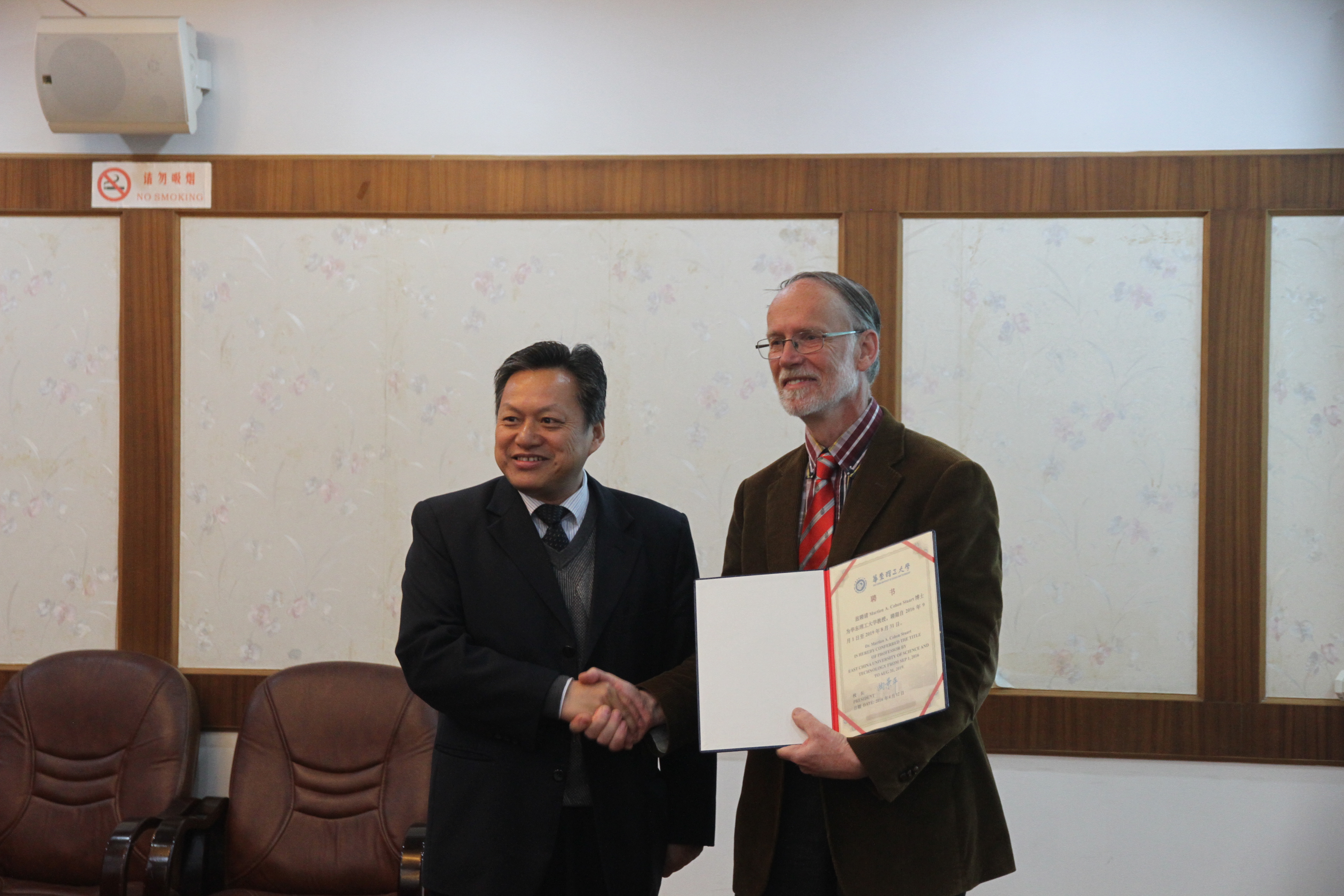 随后,赵玲院长与Martien A Cohen Stuart院士共同签署了聘用合同。辛忠副校长热烈祝贺Martien A Cohen Stuart院士成为华东理工大学的教授,并为其颁发了聘书、佩戴了华东理工大学校徽。