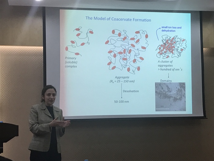 Basak KAYITMAZER教授主要介绍了她们团队在过去几年和近几年有关蛋白质和聚电解质方向的研究。主要是蛋白质和PDADMAC和壳聚糖,HA的相互作用。