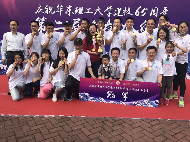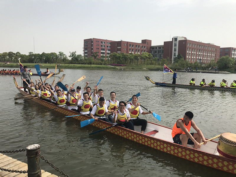 的大力支持,学院为每位返校校友准备了印有“化工”字样的polo衫,亦有化工学子为校友们做奉贤校园导游。由19名校友组成的龙舟队,有94届校友,也有16届校友。比赛前,他们和蔼可爱,共同回忆在校时光;比赛时,他们信心满满,共同喊出“化工无敌”的口号,齐心协力,勇争第一。