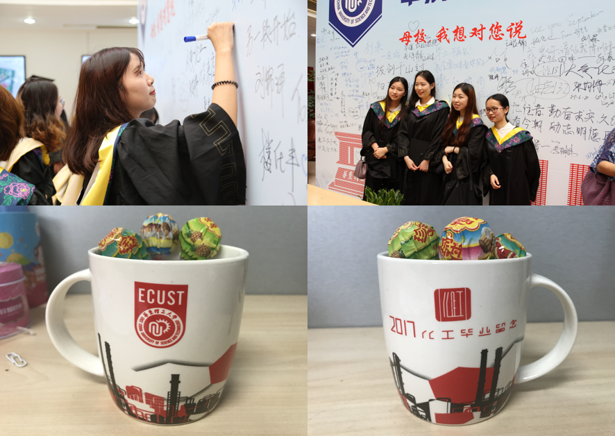 取得的各项成绩,激励化工学子勤奋求真、励志明德,为母校争光。16届毕业生陆栋栋作为校友代表向毕业生们分享了在步入社会后的成长感悟,告诫学弟学妹们要明确自我定位,合理设定目标,勇于自我表现,奋力实现自我。王评作为班导师代表,表达了对毕业生们的依依不舍之情,并希望同学们能在未来的人生道路上好好生活,不忘初心。随后,毕业生代表向全体班导师献花,表达对班导师及母校的感恩之情。学院也为毕业生们准备了由校友设计并制作的独具化工特色的水杯,杯中装上糖果预祝新一届校友甜甜蜜蜜一辈子。