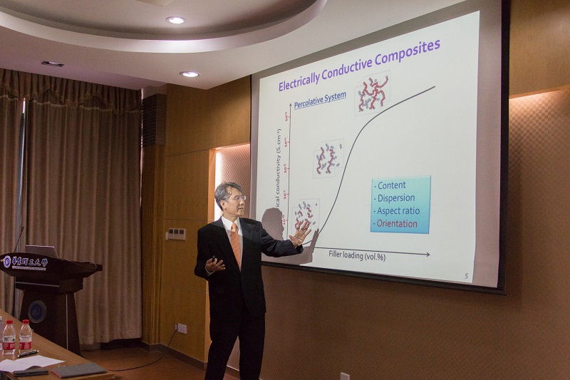 报告会上,Park教授深入浅出地介绍了多伦多大学微孔塑料制造实验室在导电复合发泡材料方面的工作,从导电填料的取向,泡孔生长对纤维分布的重排作用,导电网络的构建以及蒙特卡罗模拟导电填料的分布及其临界点等方面介绍了导电复合发泡材料的构建与表征,展现了发泡影响材料形貌和性能的奇妙作用,为大家开拓了眼界,其渊博的学识、生动的演讲也同样给师生们留下了深刻的印象。