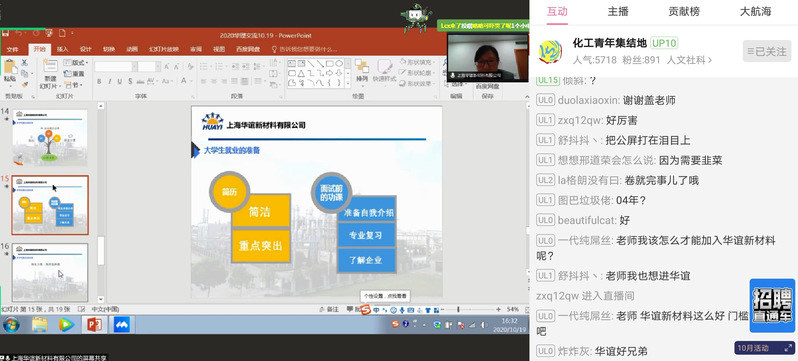 2021届毕业生就业动员会在线上召开,以帮助应届毕业生认清当前就业形势,确保就业大局稳定。华谊新材料人事经理瞿红、校就业指导中心副主任盖钧超、2020届硕士毕业生马翀玮、2020届本科毕业生杨鑫鑫应邀出席,参加会议的还有学院就业辅导员于靖和周夏青。会议通过B站平台在线直播,学院800余名本研毕业生实时收看,直播人气更是高达5700余人次。