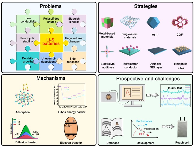 图片说明:锂硫电池面临的问题、策略、机制、前景和挑战