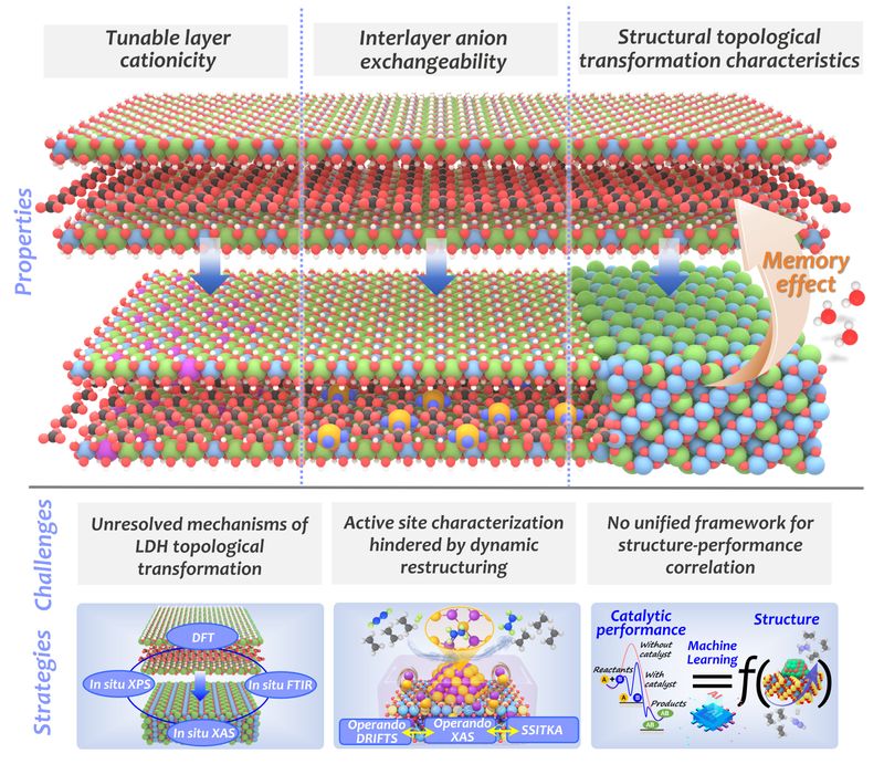 近日,我校催化反应工程团队段学志教授和曹约强特聘研究员在层状双金属氢氧化物(Layered Double Hydroxides, LDHs)基催化剂研究方面取得重要进展。受国际知名学术期刊Angewandte Chemie International Edition邀请,结合团队近年来基于LDHs材料的系列研究工作回顾总结了LDHs及其衍生催化剂在精准催化领域的研究进展,撰写了题为“Layered Double Hydroxides as Building Blocks for Precise Catalysis”的综述论文,深入探讨了其在光、电、热催化中活性位点精准调控方面的应用,为设计高效、稳定的新型催化剂、推动可持续能源转化与绿色化工发展提供借鉴。